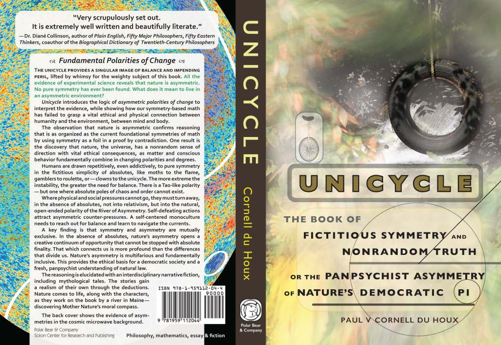 Unicycle, the Book of Fictitious Symmetry and Nonrandom Truth, or the Panpsychist Asymmetry of Nature’s Democratic Pi